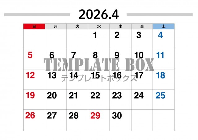 横型シンプルなカレンダー素材です。2026年4月カレンダーです。春先のお…