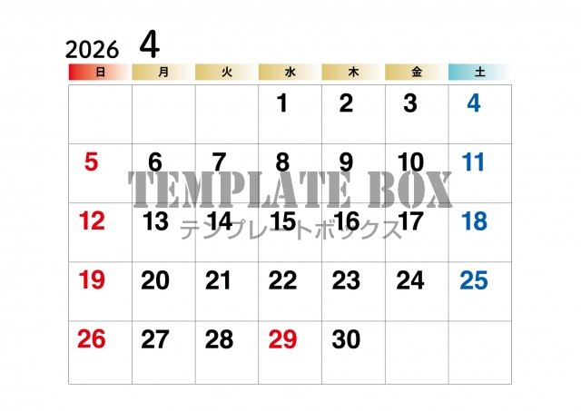 横型シンプルなカレンダー素材です。2026年4月カレンダーです。春先のお…