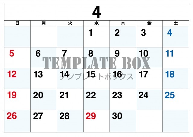 背景が白で文字を書き入れるとみやすいですよ。2026年4月カレンダーです…