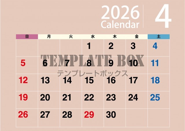 淡い配色の2026年4月カレンダーです。シンプルなデザインが場所を選ばず…
