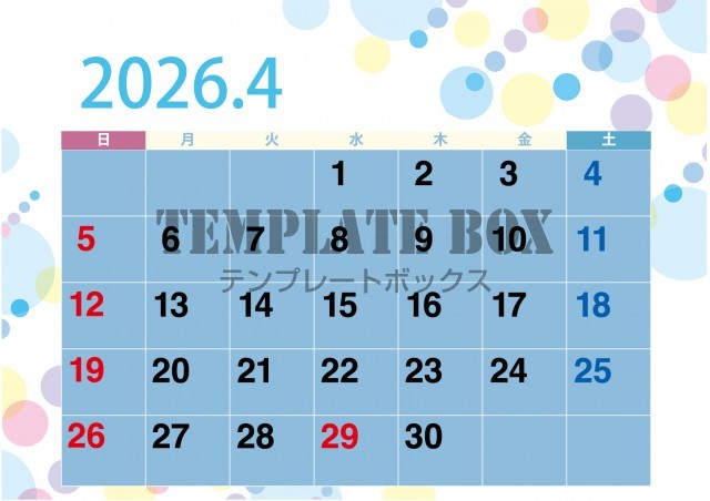 無料テンプレート:2026年4月カレンダー:横型水玉のカレンダー