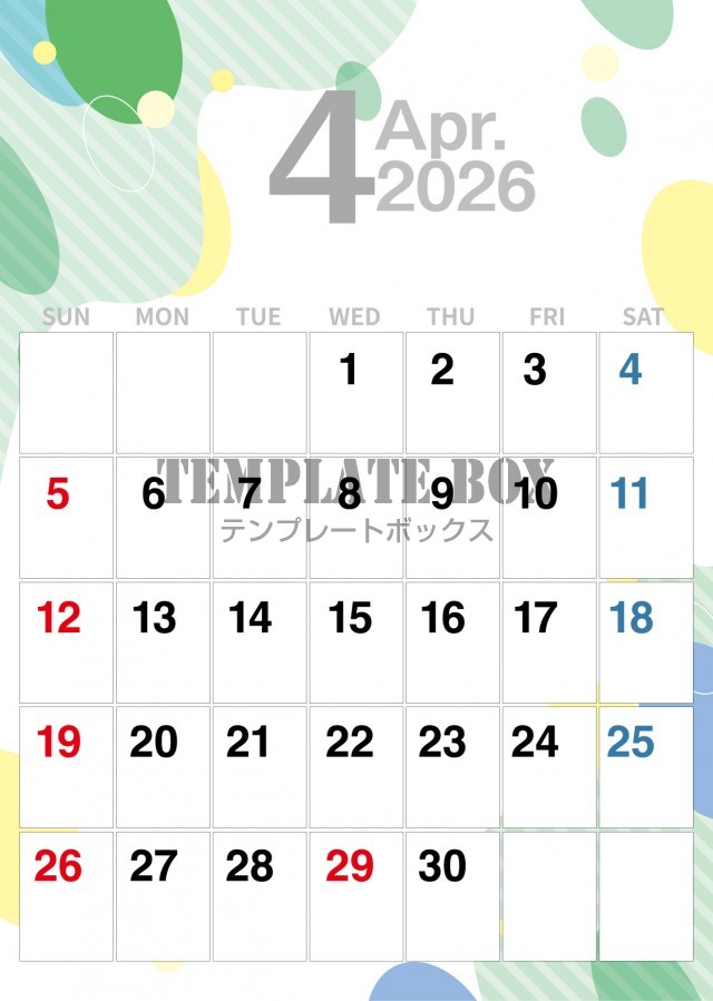 2026年4月カレンダー:春のシンプルさわやかカレンダー