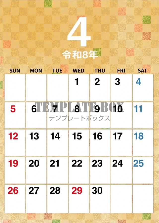 無料テンプレート:2026年4月カレンダー:縦型市松模様のカレンダー