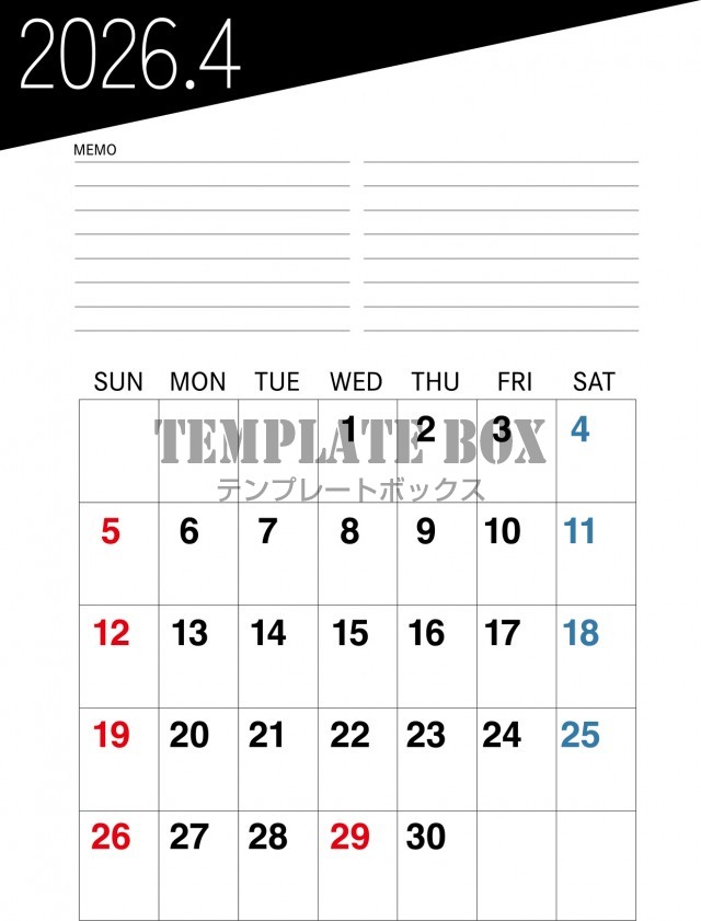 無料テンプレート:2026年4月カレンダー:縦型シンプルベストなカレンダー