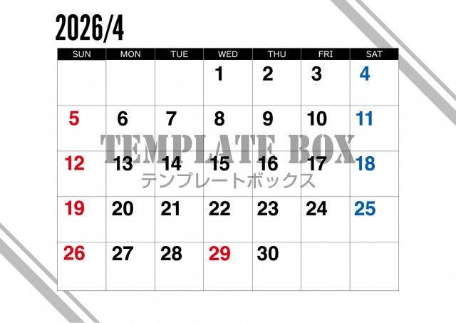 無料テンプレート:2026年4月カレンダー:横型機能性あるカレンダー