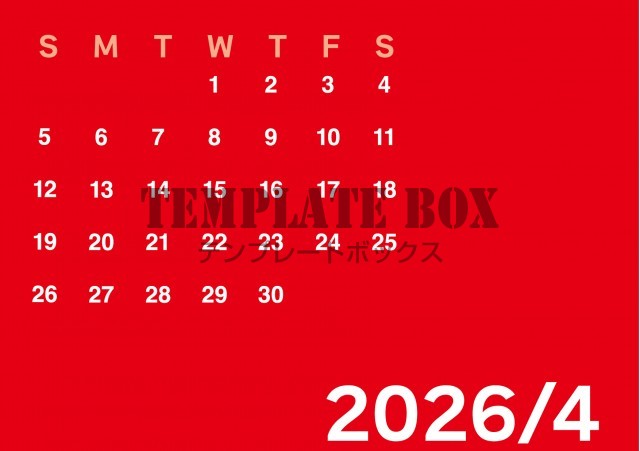 無料テンプレート:2026年4月カレンダー:赤が目立つカレンダー
