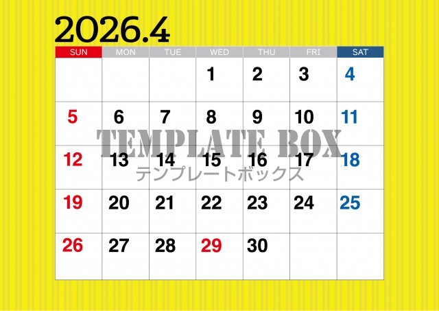 無料テンプレート:2026年4月カレンダー:横型黄色のカレンダー
