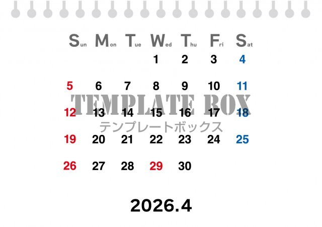 無料テンプレート:2026年4月カレンダー:シンプル便利なカレンダー
