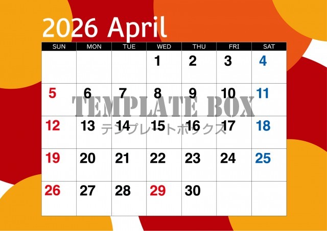 背景が赤でおしゃれなカレンダーです。2026年4月カレンダーです。モダン…