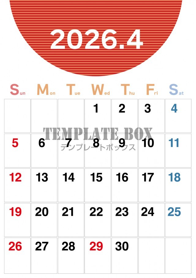 背景が赤でおしゃれなカレンダーです。2026年4月カレンダーです。モダン…