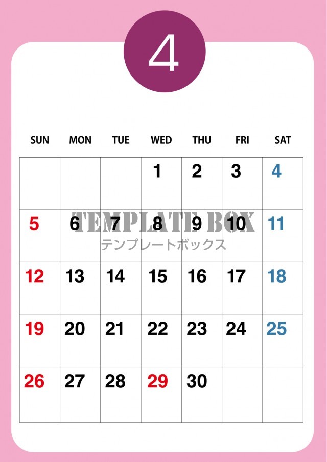 縦型赤がかっこいいカレンダーです。2026年4月カレンダーです。平日が黒…