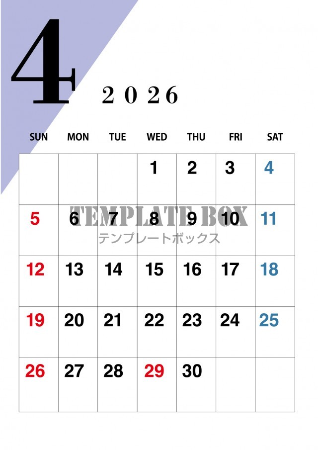 2026年4月カレンダー:シンプル便利なカレンダー