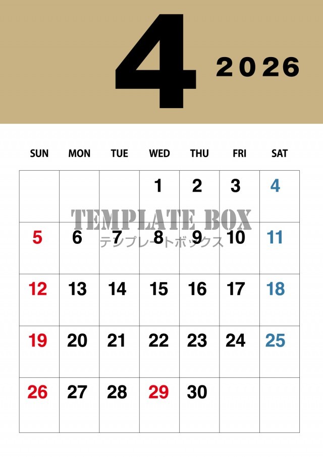 2026年4月カレンダー:ナチュラルカラーカレンダー