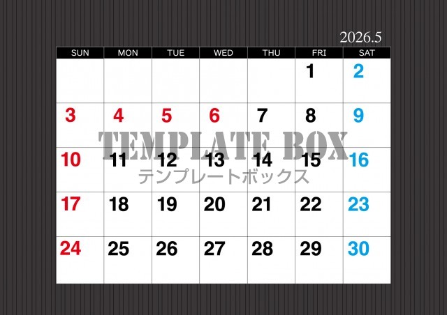 無料テンプレート:2026年5月カレンダー:黒のかっこいいカレンダー