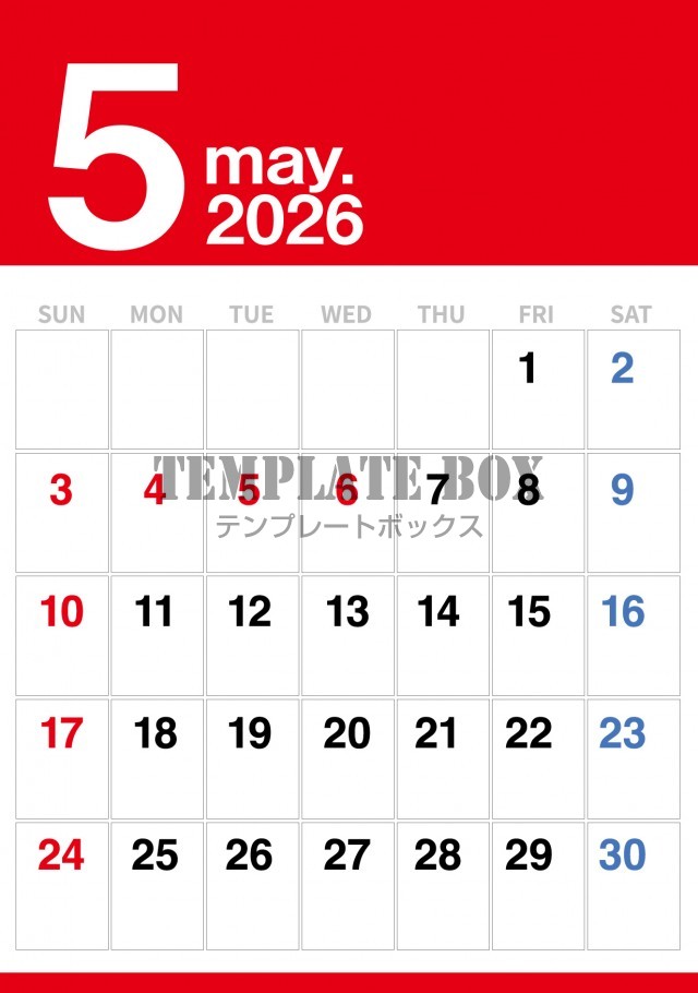 無料テンプレート:2026年5月カレンダー:使いやすいカレンダー