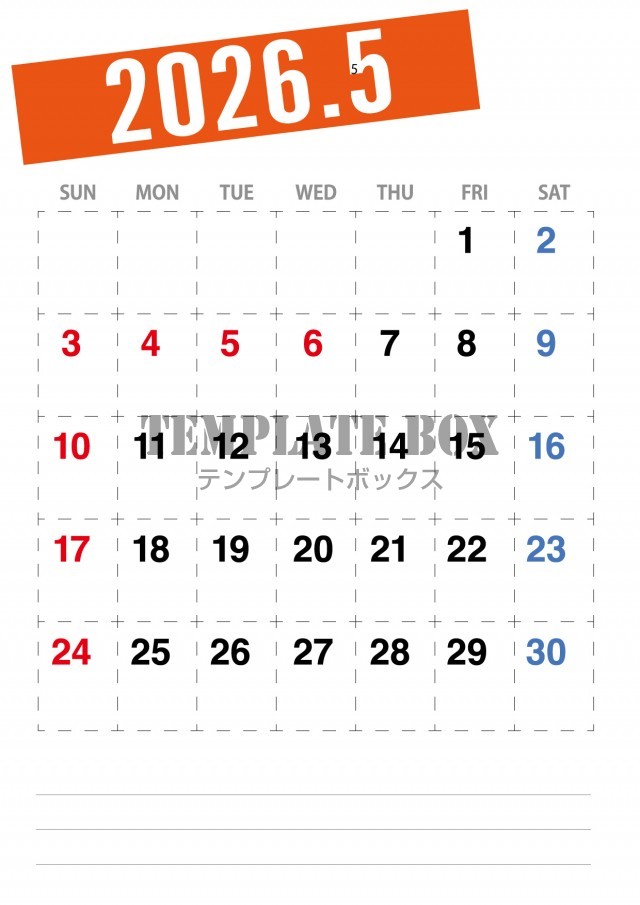 無料テンプレート:2026年5月カレンダー:オレンジ色がかわいいカレンダー