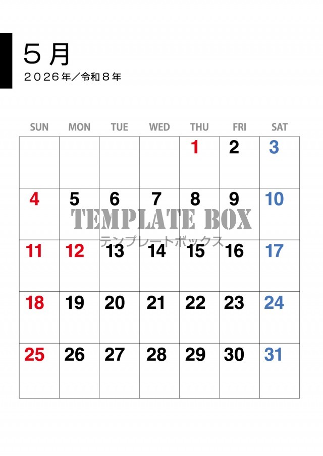 無料テンプレート:2026年5月カレンダー:縦型書きやすいカレンダー