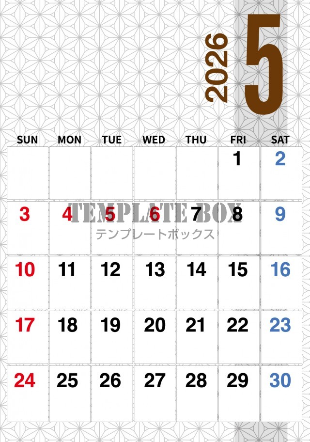 無料テンプレート:2026年5月カレンダー:麻の葉模様和風デザイン