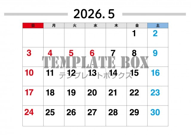 無料テンプレート:2026年5月カレンダー:横型みやすいカレンダー