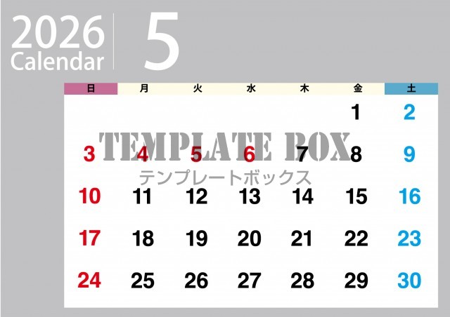 無料テンプレート:2026年5月カレンダー:オシャレデザイングレー色