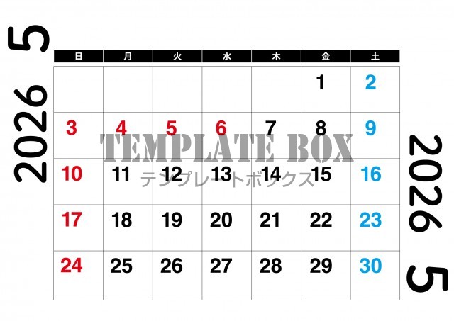 2026年5月カレンダー:横型シンプルデザイン