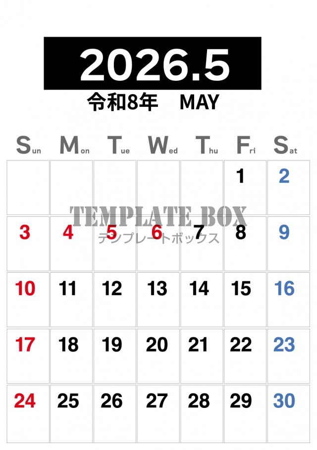 2026年5月カレンダー:シンプルでかっこいいカレンダー