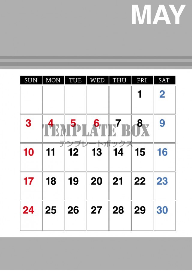 無料テンプレート:2026年5月カレンダー:縦型グレーのおしゃれなカレンダー