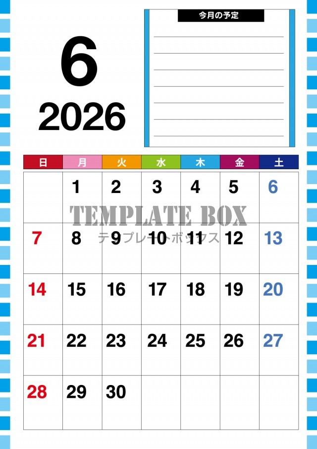 2026年6月カレンダー:横型ストライプカラフル
