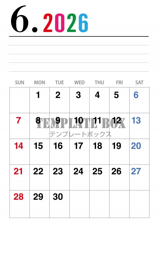 2026年6月カレンダー:縦型メモ付きカレンダー