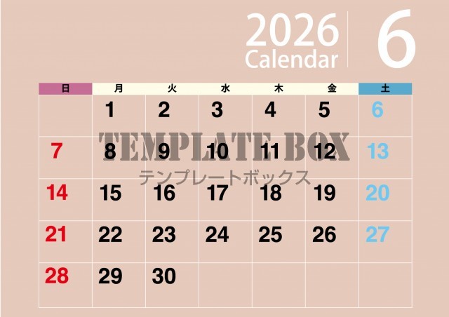 無料テンプレート:2026年6月カレンダー:横型ナチュラルカラー