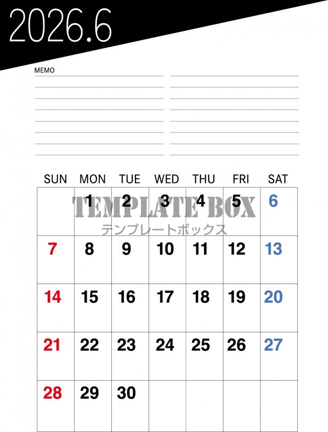 無料テンプレート:2026年6月カレンダー:縦型メモ付きカレンダー