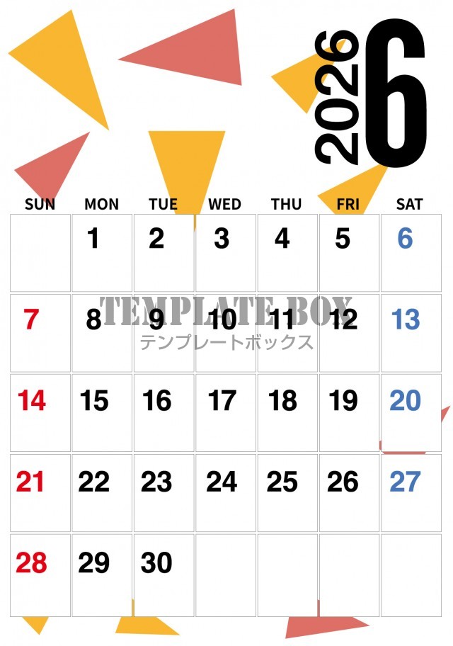 無料テンプレート:2026年6月カレンダー:縦型三角がかわいいカレンダー