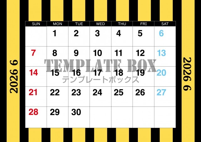 無料テンプレート:2026年6月カレンダー:横型派手なカレンダー