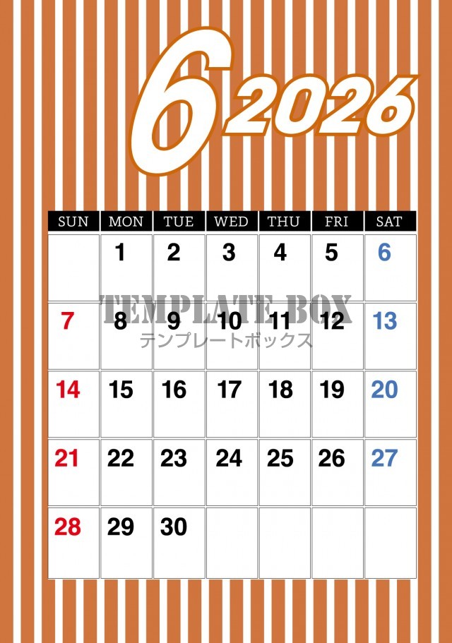 無料テンプレート:2026年6月カレンダー:縦型ストライプ柄カレンダー