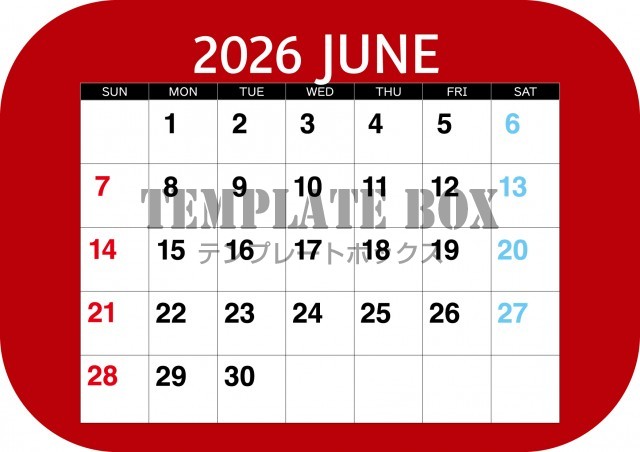無料テンプレート:2026年6月カレンダー:横型みやすいカレンダー