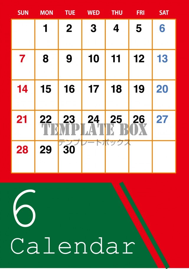 オレンジのおしゃれなカレンダーです。2026年6月カレンダーです。みやす…