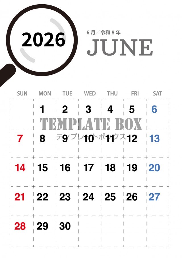 無料テンプレート:2026年6月カレンダー:縦型枠つきカレンダー