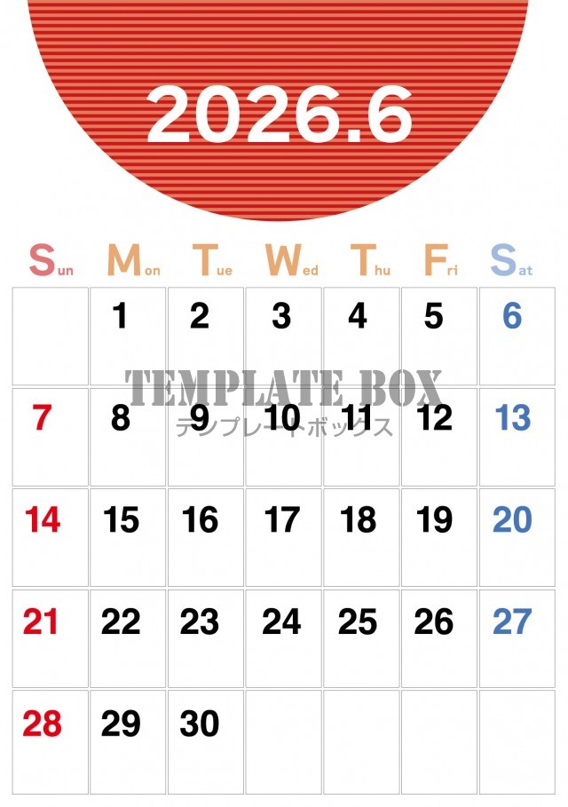 無料テンプレート:2026年6月カレンダー:縦型みやすいカレンダー