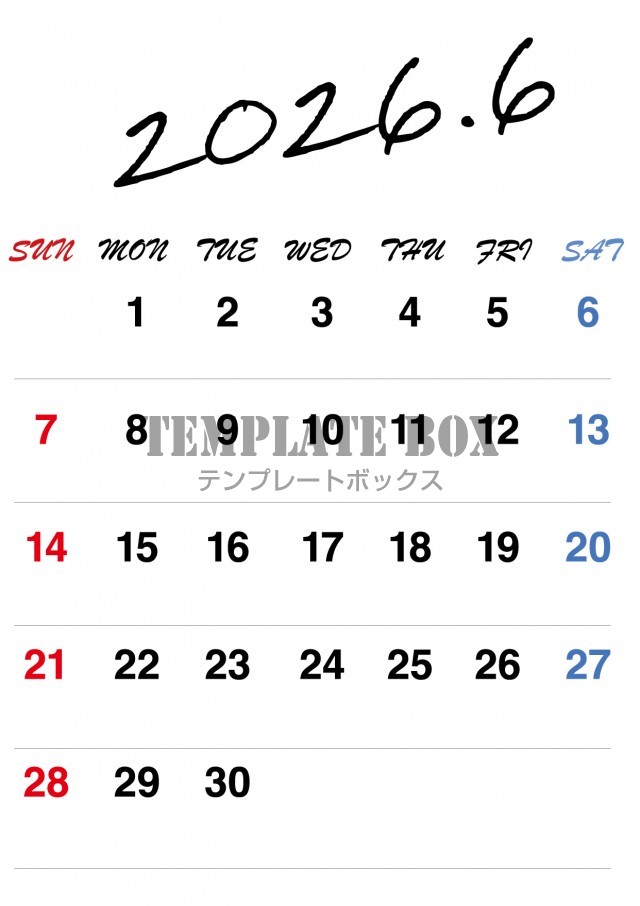 無料テンプレート:2026年6月カレンダー:縦型モノクロ筆記体