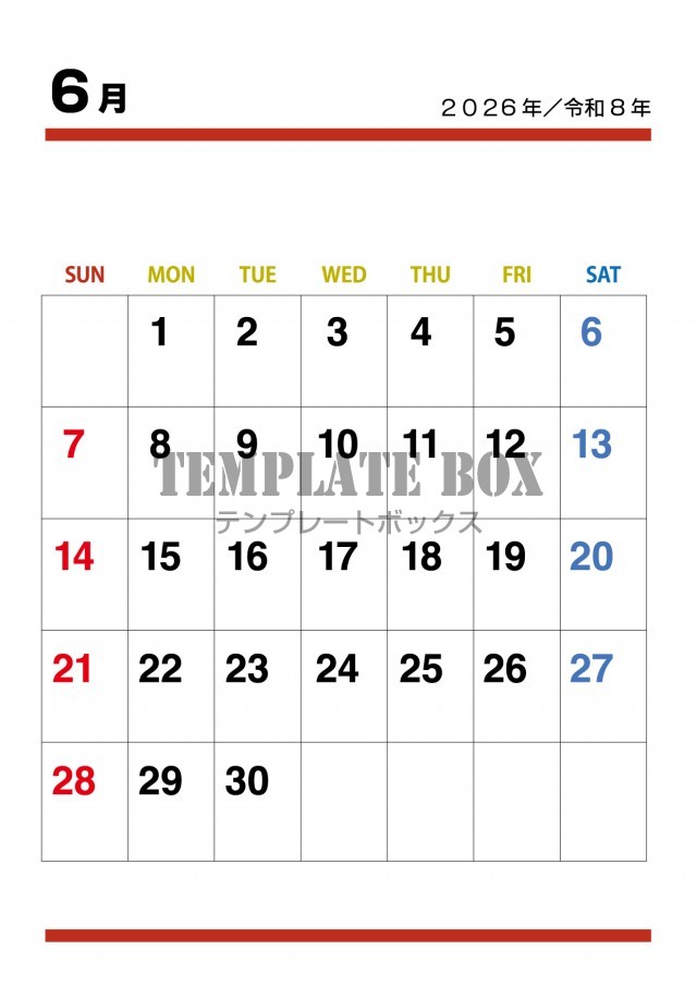 2026年6月カレンダーです。明るいカラーが特徴的なシンプルなカレンダー…