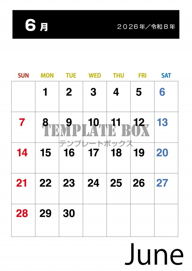 枠で仕切られて予定が管理しやすい便利なカレンダー素材です。2026年6月…
