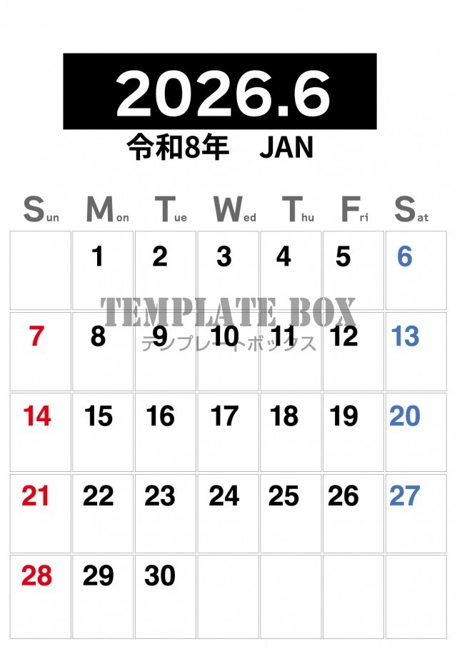 無料テンプレート:2026年6月カレンダー:縦型枠付きカレンダー