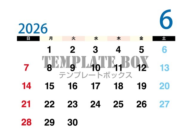 シンプルなデザインで場所を選ばずにおけるカレンダー素材です。2026年6…