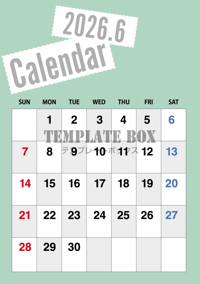 無料テンプレート:2026年6月カレンダー:おしゃれなカレンダー