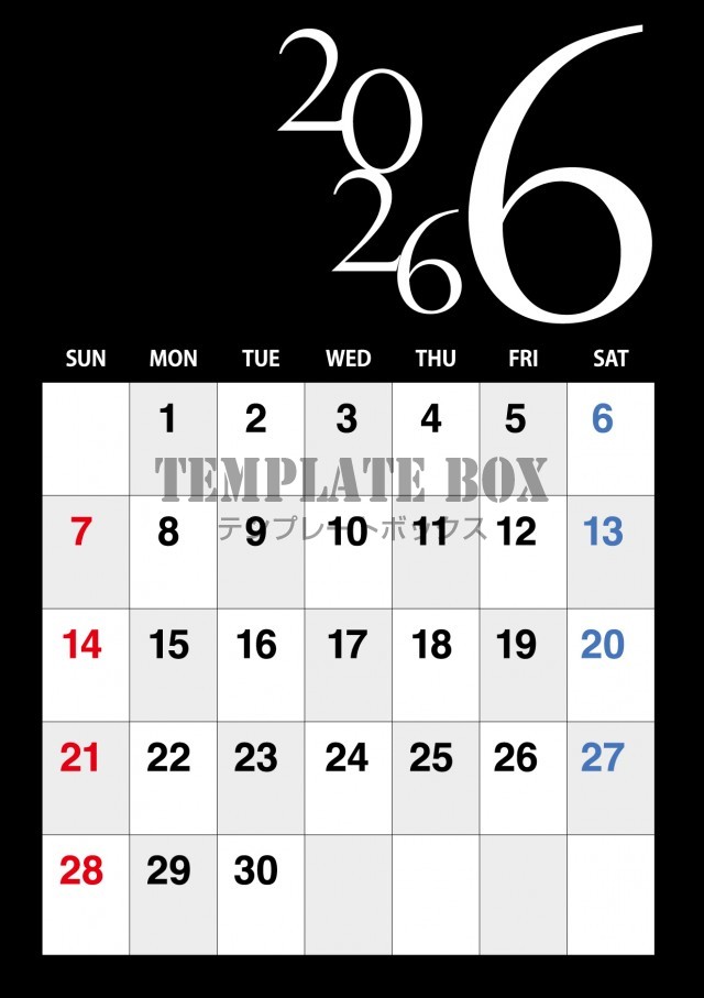 みやすいカレンダーです。2026年6月カレンダーです。モノクロベースのデ…