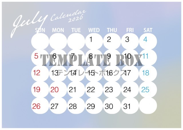無料テンプレート:2026年7月カレンダー:横型グラデが美しいカレンダー
