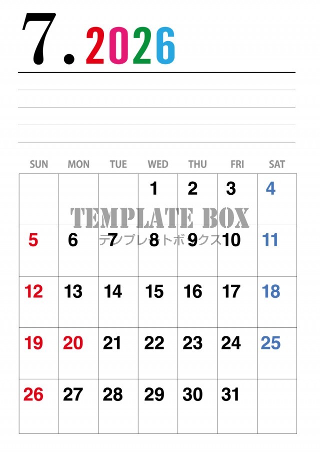 2026年7月カレンダー:爽やか配色カレンダー