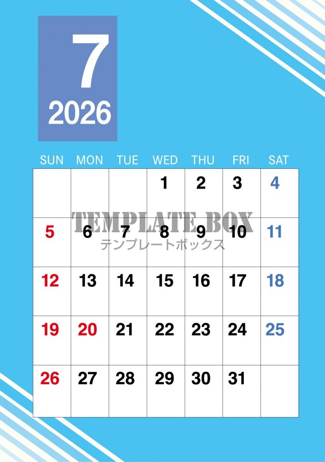 2026年7月カレンダー:爽やか配色カレンダー