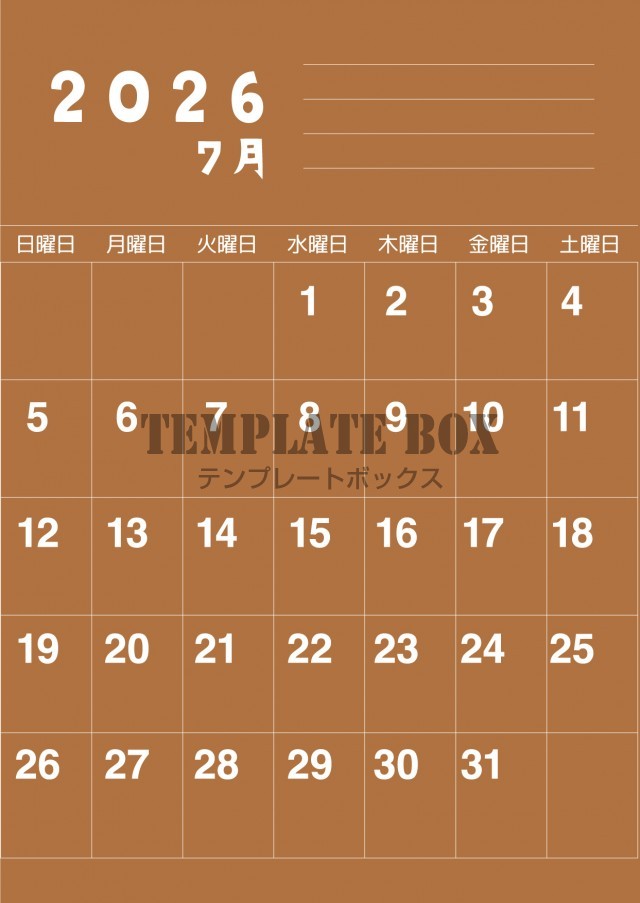 無料テンプレート:2026年7月カレンダー:縦型ブラウンカラーのカレンダー