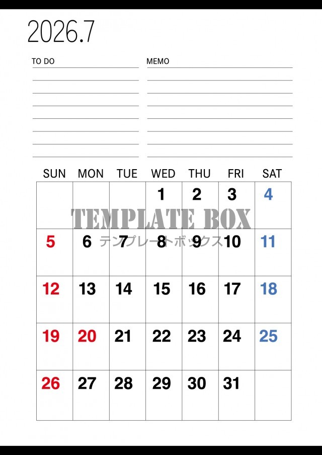 2026年7月カレンダー:みやすいカレンダー